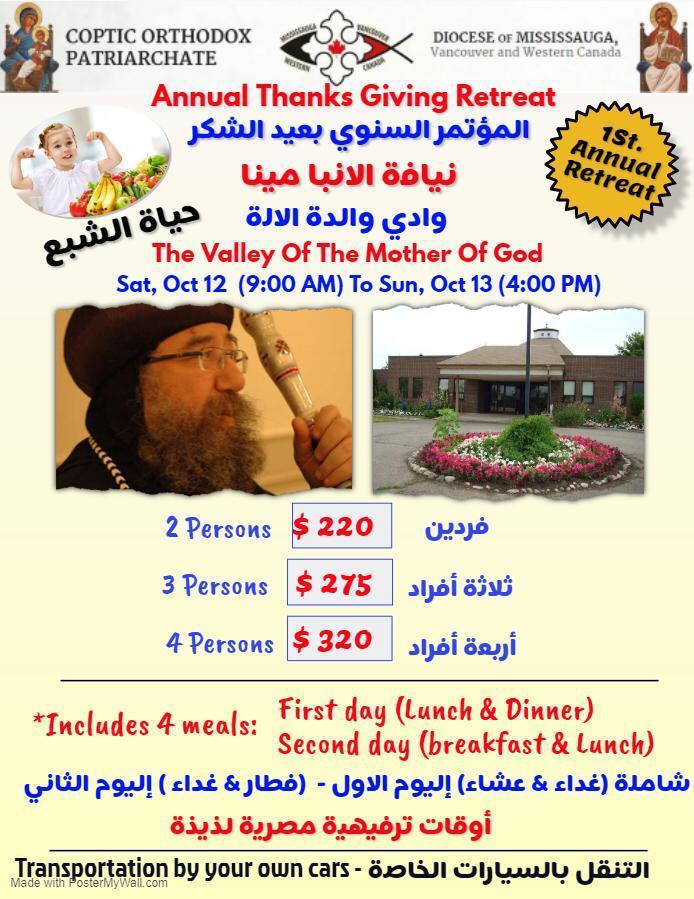 Registration for the first annual thanksgiving retreat featuring his grace Bishop Mina is now open. Please contact Fadi Rofael 1 (647) 700-4117 to book your spot.